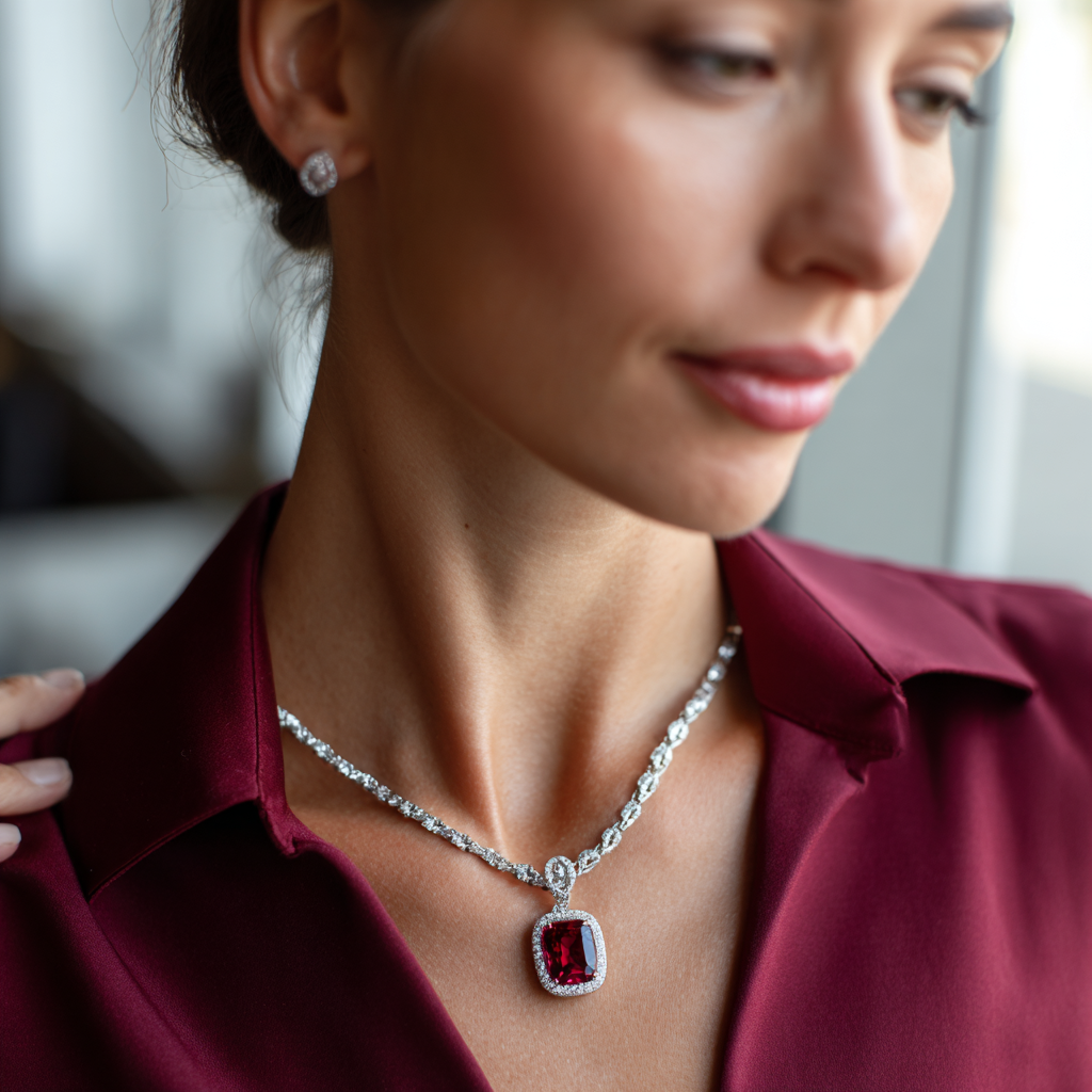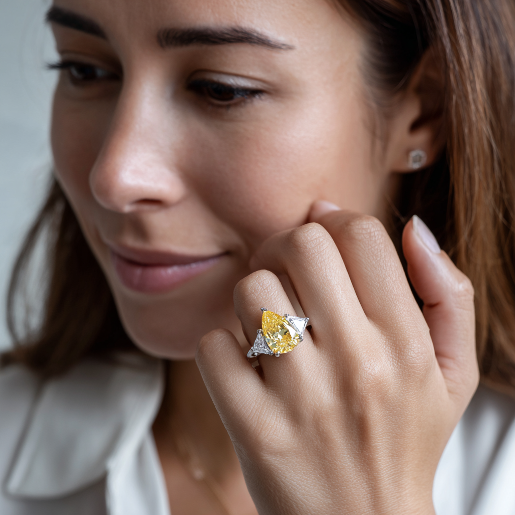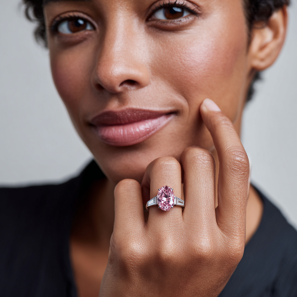 A harmony of soft curves and linear grace. This elegant design features a lab-grown pear-cut pink diamond as its luminous centerpiece, flanked by two tapered baguette diamonds that gently frame its teardrop silhouette. Set...